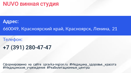 NUVO, винная студия по адресу 660049, Красноярский край, Красноярск, Ленина, 21 в дальнейшем Организация, размещена в следующих категориях: