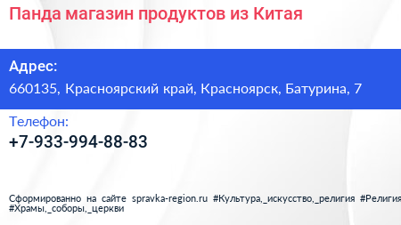 Панда, магазин продуктов из Китая по адресу 660135, Красноярский край, Красноярск, Батурина, 7 в дальнейшем Организация, размещена в следующих категориях:
