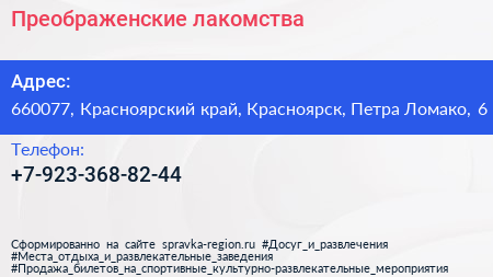 Преображенские лакомства по адресу 660077, Красноярский край, Красноярск, Петра Ломако, 6 в дальнейшем Организация, размещена в следующих категориях: