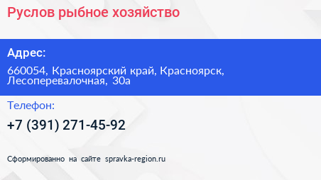 Руслов, рыбное хозяйство по адресу 660054, Красноярский край, Красноярск, Лесоперевалочная, 30а в дальнейшем Организация, размещена в следующих категориях: