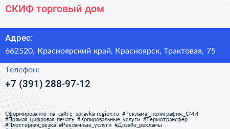 СКИФ, торговый дом по адресу 662520, Красноярский край, Красноярск, Трактовая, 75 в дальнейшем Организация, размещена в следующих категориях: