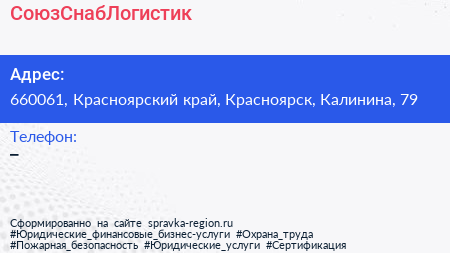 СоюзСнабЛогистик по адресу 660061, Красноярский край, Красноярск, Калинина, 79 в дальнейшем Организация, размещена в следующих категориях: