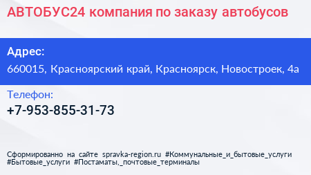 АВТОБУС24, компания по заказу автобусов по адресу 660015, Красноярский край, Красноярск, Новостроек, 4а в дальнейшем Организация, размещена в следующих категориях: