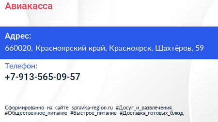 Авиакасса по адресу 660020, Красноярский край, Красноярск, Шахтёров, 59 в дальнейшем Организация, размещена в следующих категориях: