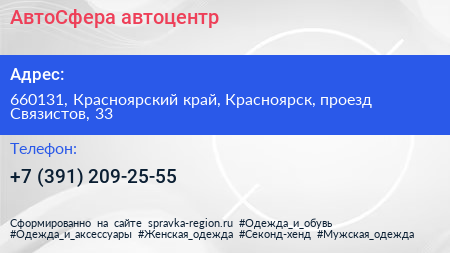 АвтоСфера, автоцентр по адресу 660131, Красноярский край, Красноярск, проезд Связистов, 33 в дальнейшем Организация, размещена в следующих категориях: