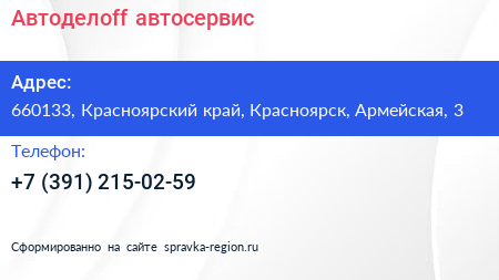 Автоделоff, автосервис по адресу 660133, Красноярский край, Красноярск, Армейская, 3 в дальнейшем Организация, размещена в следующих категориях: