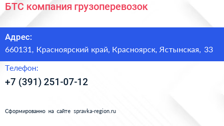 БТС, компания грузоперевозок по адресу 660131, Красноярский край, Красноярск, Ястынская, 33 в дальнейшем Организация, размещена в следующих категориях: