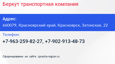 Беркут, транспортная компания по адресу 660079, Красноярский край, Красноярск, Затонская, 22 в дальнейшем Организация, размещена в следующих категориях: