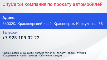 CityCar24, компания по прокату автомобилей по адресу 660020, Красноярский край, Красноярск, Караульная, 88 в дальнейшем Организация, размещена в следующих категориях: