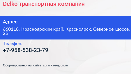 Delko, транспортная компания по адресу 660118, Красноярский край, Красноярск, Северное шоссе, 25 в дальнейшем Организация, размещена в следующих категориях:
