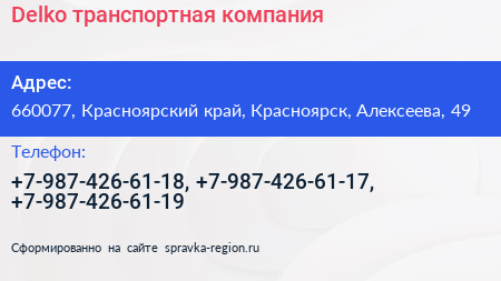 Delko, транспортная компания по адресу 660077, Красноярский край, Красноярск, Алексеева, 49 в дальнейшем Организация, размещена в следующих категориях: