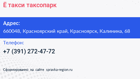 Ё-такси, таксопарк по адресу 660048, Красноярский край, Красноярск, Калинина, 68 в дальнейшем Организация, размещена в следующих категориях: