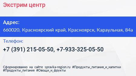 Экстрим-центр по адресу 660020, Красноярский край, Красноярск, Караульная, 84а в дальнейшем Организация, размещена в следующих категориях: