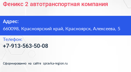 Феникс 2, автотранспортная компания по адресу 660098, Красноярский край, Красноярск, Алексеева, 5 в дальнейшем Организация, размещена в следующих категориях: