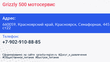 Grizzly 500, мотосервис по адресу 660059, Красноярский край, Красноярск, Семафорная, 445 ст22 в дальнейшем Организация, размещена в следующих категориях: