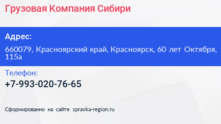 Грузовая Компания Сибири по адресу 660079, Красноярский край, Красноярск, 60 лет Октября, 115а в дальнейшем Организация, размещена в следующих категориях: