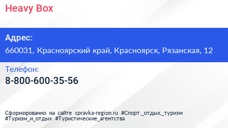 Heavy Box по адресу 660031, Красноярский край, Красноярск, Рязанская, 12 в дальнейшем Организация, размещена в следующих категориях: