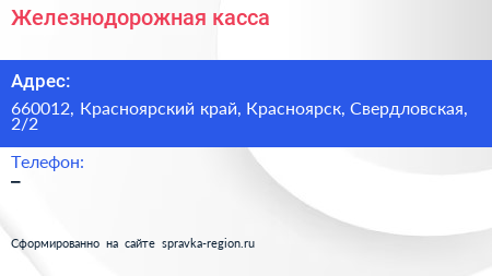 Железнодорожная касса по адресу 660012, Красноярский край, Красноярск, Свердловская, 2/2 в дальнейшем Организация, размещена в следующих категориях: