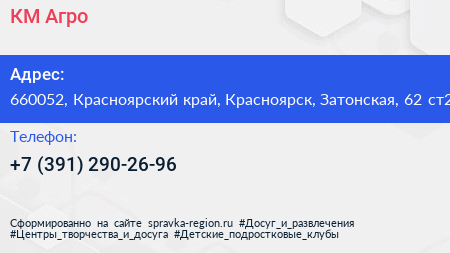 КМ-Агро по адресу 660052, Красноярский край, Красноярск, Затонская, 62 ст2 в дальнейшем Организация, размещена в следующих категориях: