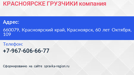 КРАСНОЯРСКЕ ГРУЗЧИКИ, компания по адресу 660079, Красноярский край, Красноярск, 60 лет Октября, 109 в дальнейшем Организация, размещена в следующих категориях: