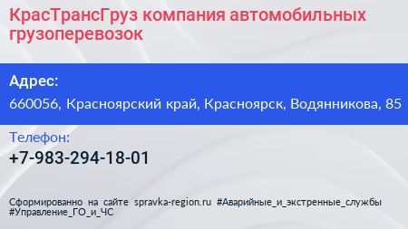 КрасТрансГруз, компания автомобильных грузоперевозок по адресу 660056, Красноярский край, Красноярск, Водянникова, 85 в дальнейшем Организация, размещена в следующих категориях: