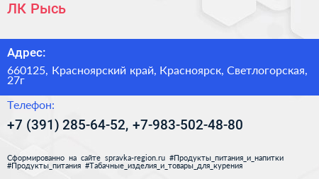 ЛК Рысь по адресу 660125, Красноярский край, Красноярск, Светлогорская, 27г в дальнейшем Организация, размещена в следующих категориях: