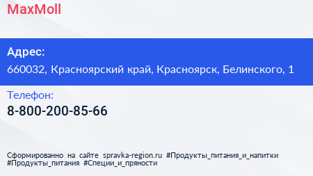 MaxMoll по адресу 660032, Красноярский край, Красноярск, Белинского, 1 в дальнейшем Организация, размещена в следующих категориях: