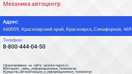 Механика, автоцентр по адресу 660059, Красноярский край, Красноярск, Семафорная, 469 в дальнейшем Организация, размещена в следующих категориях: