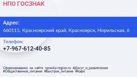 НПО ГОСЗНАК по адресу 660115, Красноярский край, Красноярск, Норильская, 6 в дальнейшем Организация, размещена в следующих категориях: