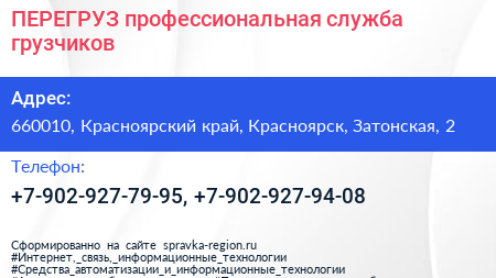 ПЕРЕГРУЗ, профессиональная служба грузчиков по адресу 660010, Красноярский край, Красноярск, Затонская, 2 в дальнейшем Организация, размещена в следующих категориях: