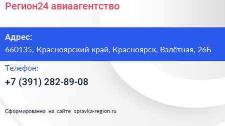 Регион24, авиаагентство по адресу 660135, Красноярский край, Красноярск, Взлётная, 26Б в дальнейшем Организация, размещена в следующих категориях: