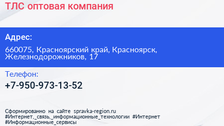 ТЛС, оптовая компания по адресу 660075, Красноярский край, Красноярск, Железнодорожников, 17 в дальнейшем Организация, размещена в следующих категориях: