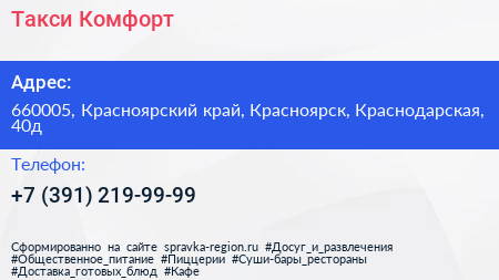 Такси Комфорт по адресу 660005, Красноярский край, Красноярск, Краснодарская, 40д в дальнейшем Организация, размещена в следующих категориях: