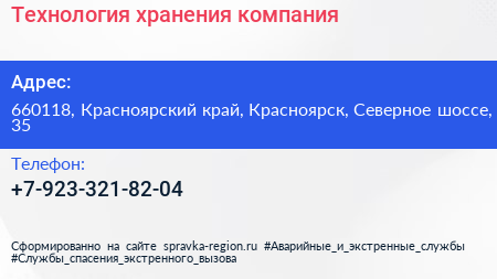 Технология хранения, компания по адресу 660118, Красноярский край, Красноярск, Северное шоссе, 35 в дальнейшем Организация, размещена в следующих категориях: