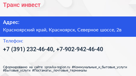 Транс-инвест по адресу Красноярский край, Красноярск, Северное шоссе, 2в в дальнейшем Организация, размещена в следующих категориях: