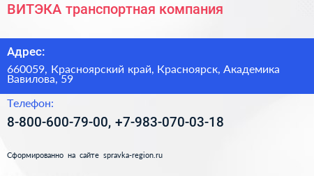 ВИТЭКА, транспортная компания по адресу 660059, Красноярский край, Красноярск, Академика Вавилова, 59 в дальнейшем Организация, размещена в следующих категориях:
