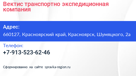 Вектис, транспортно-экспедиционная компания по адресу 660127, Красноярский край, Красноярск, Шумяцкого, 2а в дальнейшем Организация, размещена в следующих категориях: