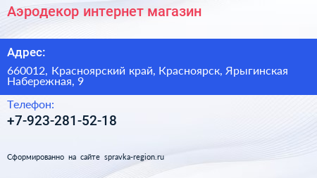 Аэродекор, интернет-магазин по адресу 660012, Красноярский край, Красноярск, Ярыгинская Набережная, 9 в дальнейшем Организация, размещена в следующих категориях:
