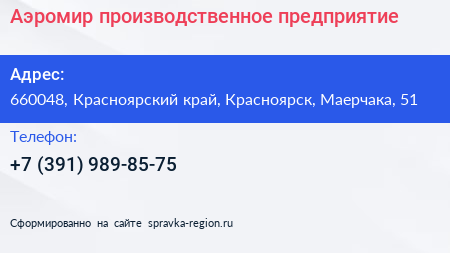 Аэромир, производственное предприятие по адресу 660048, Красноярский край, Красноярск, Маерчака, 51 в дальнейшем Организация, размещена в следующих категориях: