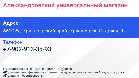 Александровский, универсальный магазин по адресу 663029, Красноярский край, Красноярск, Садовая, 1Б в дальнейшем Организация, размещена в следующих категориях: