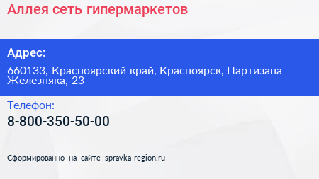 Аллея, сеть гипермаркетов по адресу 660133, Красноярский край, Красноярск, Партизана Железняка, 23 в дальнейшем Организация, размещена в следующих категориях: