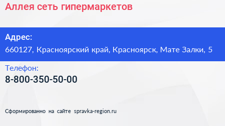 Аллея, сеть гипермаркетов по адресу 660127, Красноярский край, Красноярск, Мате Залки, 5 в дальнейшем Организация, размещена в следующих категориях:
