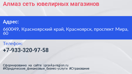 Алмаз, сеть ювелирных магазинов по адресу 660049, Красноярский край, Красноярск, проспект Мира, 60 в дальнейшем Организация, размещена в следующих категориях: