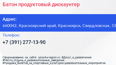 Батон, продуктовый дискаунтер по адресу 660042, Красноярский край, Красноярск, Свердловская, 53 в дальнейшем Организация, размещена в следующих категориях: