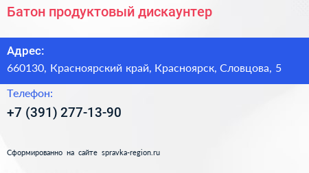 Батон, продуктовый дискаунтер по адресу 660130, Красноярский край, Красноярск, Словцова, 5 в дальнейшем Организация, размещена в следующих категориях: