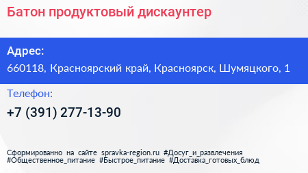 Батон, продуктовый дискаунтер по адресу 660118, Красноярский край, Красноярск, Шумяцкого, 1 в дальнейшем Организация, размещена в следующих категориях: