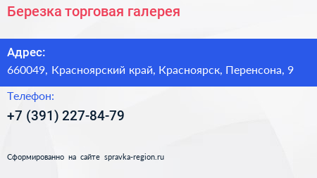 Березка, торговая галерея по адресу 660049, Красноярский край, Красноярск, Перенсона, 9 в дальнейшем Организация, размещена в следующих категориях: