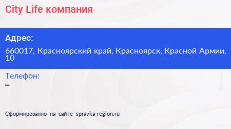 City Life, компания по адресу 660017, Красноярский край, Красноярск, Красной Армии, 10 в дальнейшем Организация, размещена в следующих категориях: