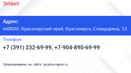 Элант по адресу 660020, Красноярский край, Красноярск, Спандаряна, 13 в дальнейшем Организация, размещена в следующих категориях: