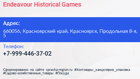 Endeavour Historical Games по адресу 660056, Красноярский край, Красноярск, Продольная 8-я, 5 в дальнейшем Организация, размещена в следующих категориях: